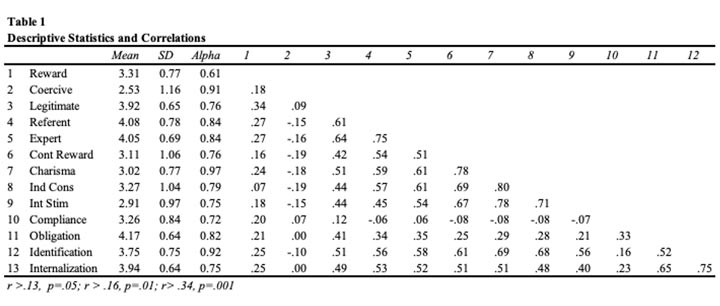 Correlations and reliabilities. Table 1 reports the scale means, standard deviations, correlations, and reliabilities for the study variables. These results emphasize three points. First, all the scales obtained acceptable alpha coefficients (greater than .70; Nunnally, 1978), except for the reward scale (a = .61). Schaffer, Tepper, and Percy (1996) identified issues with Hinkin & Schriescheim’s item 3 of the reward scale that impacts reward’s internal consistency. Second, the signs on the significant correlations between the power scales, leadership scales, and the motivation for conformity scales revealed relationships generally consistent with the hypotheses. One exception is that none of the leadership behaviors demonstrated a significant relationship with compliance as a motive for follower conformity.