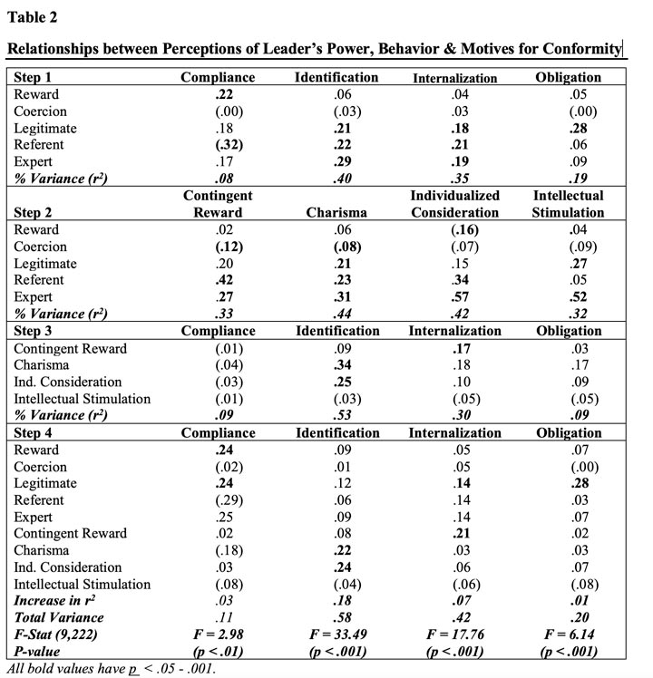 Step 4 – when both power and leadership are regressed on motives for conformity, the power variable becomes insignificant, the leadership variable continues to demonstrate a significant relationship in a full mediation model, and the percent of variance explained (r2) increases significantly from step 1.